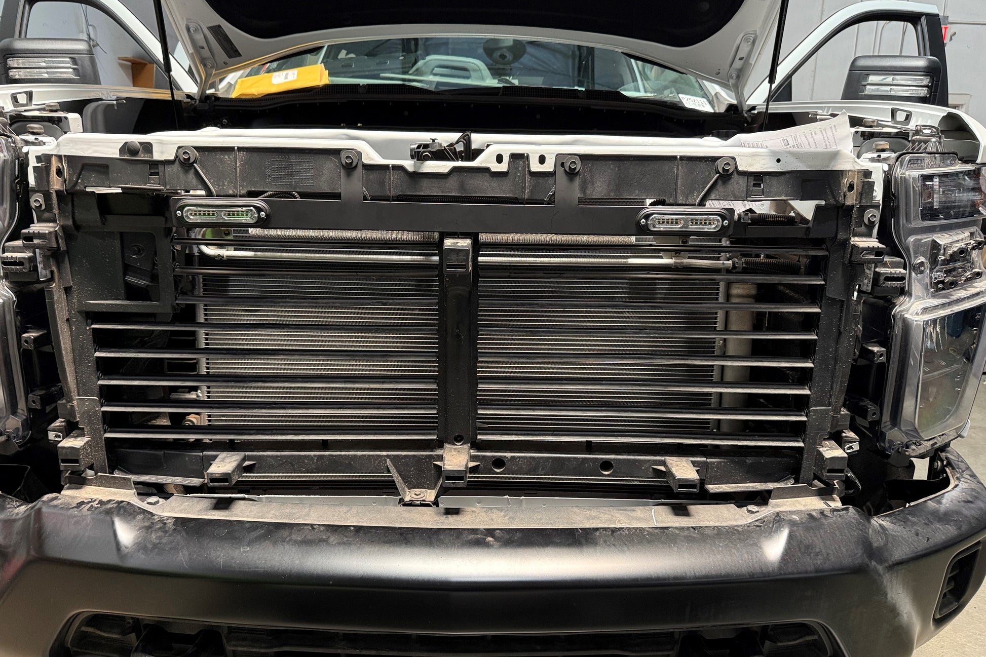 This bracket is designed to mount two Whelen T-Series light heads behind the grille of a Silverado 2500.